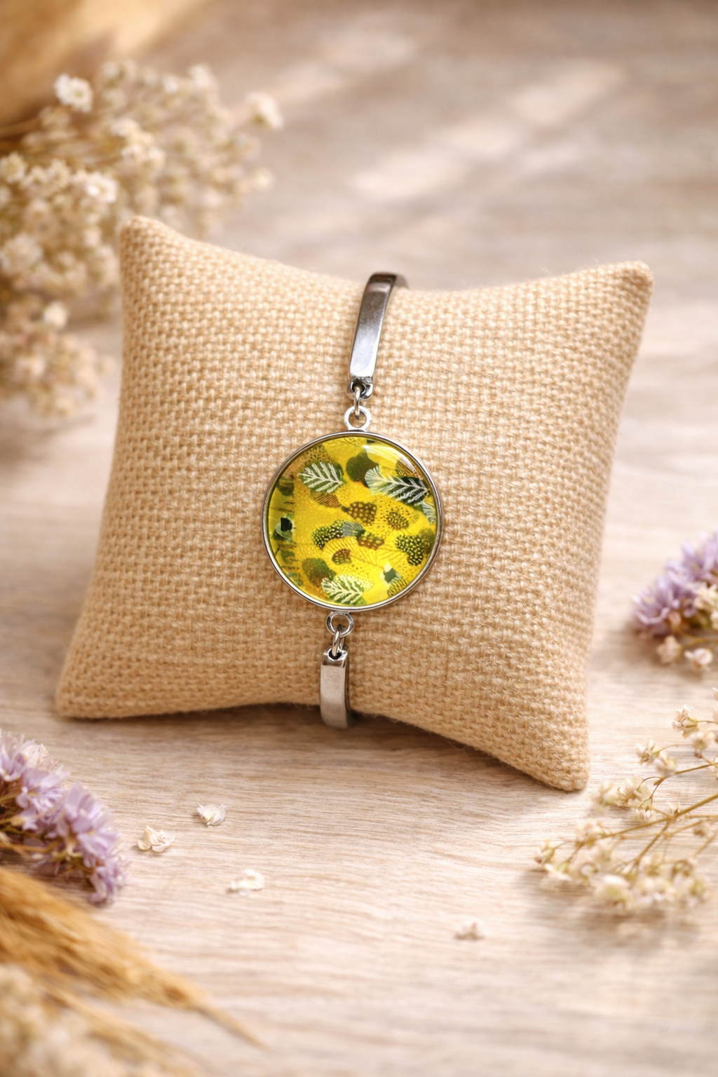 Bracelet au style bohème chic, composé d’un cabochon rond délicatement illustré, monté sur une base en acier inoxydable.