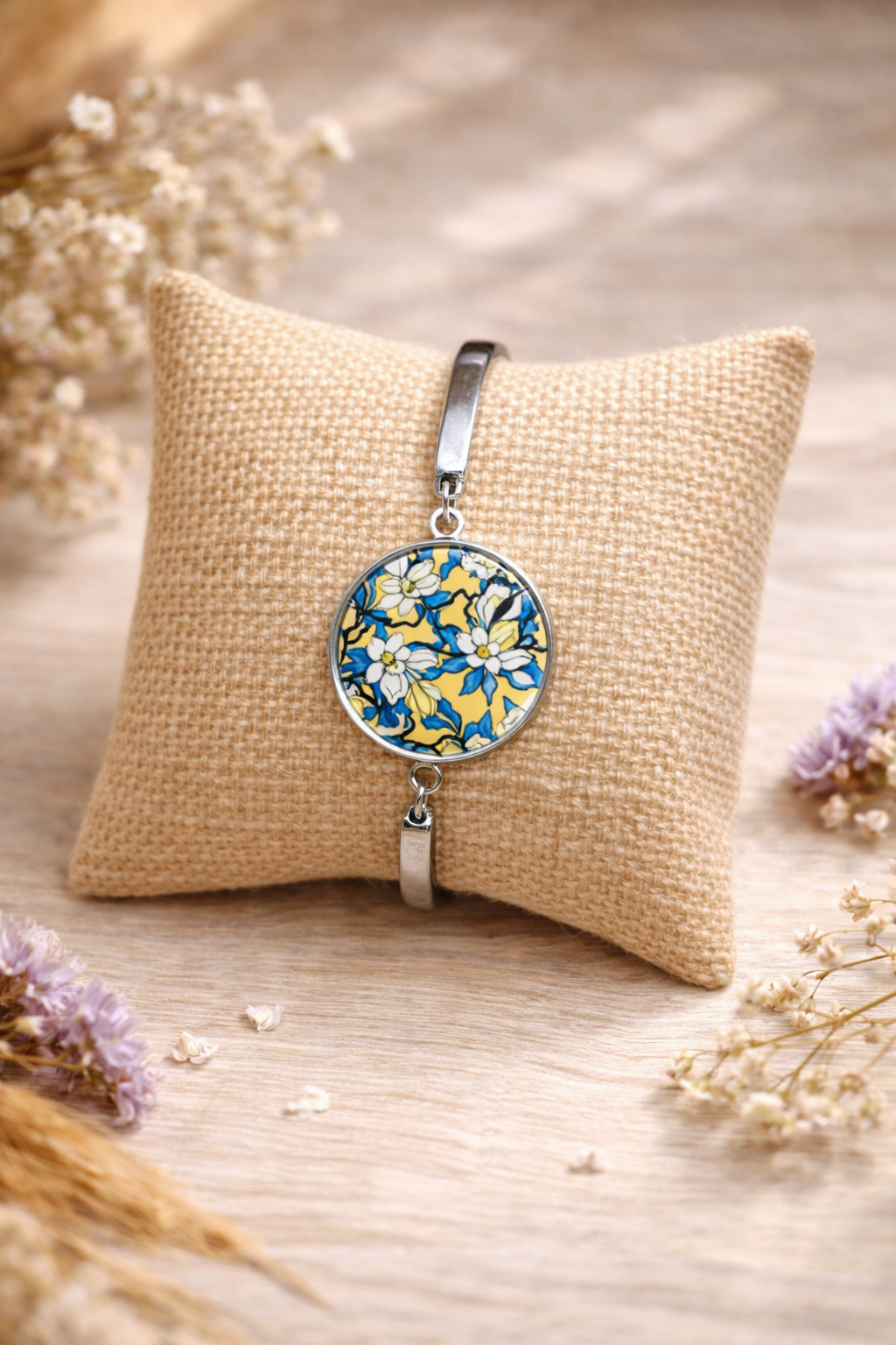 Bracelet au style bohème chic, composé d’un cabochon rond délicatement illustré, monté sur une base en acier inoxydable.