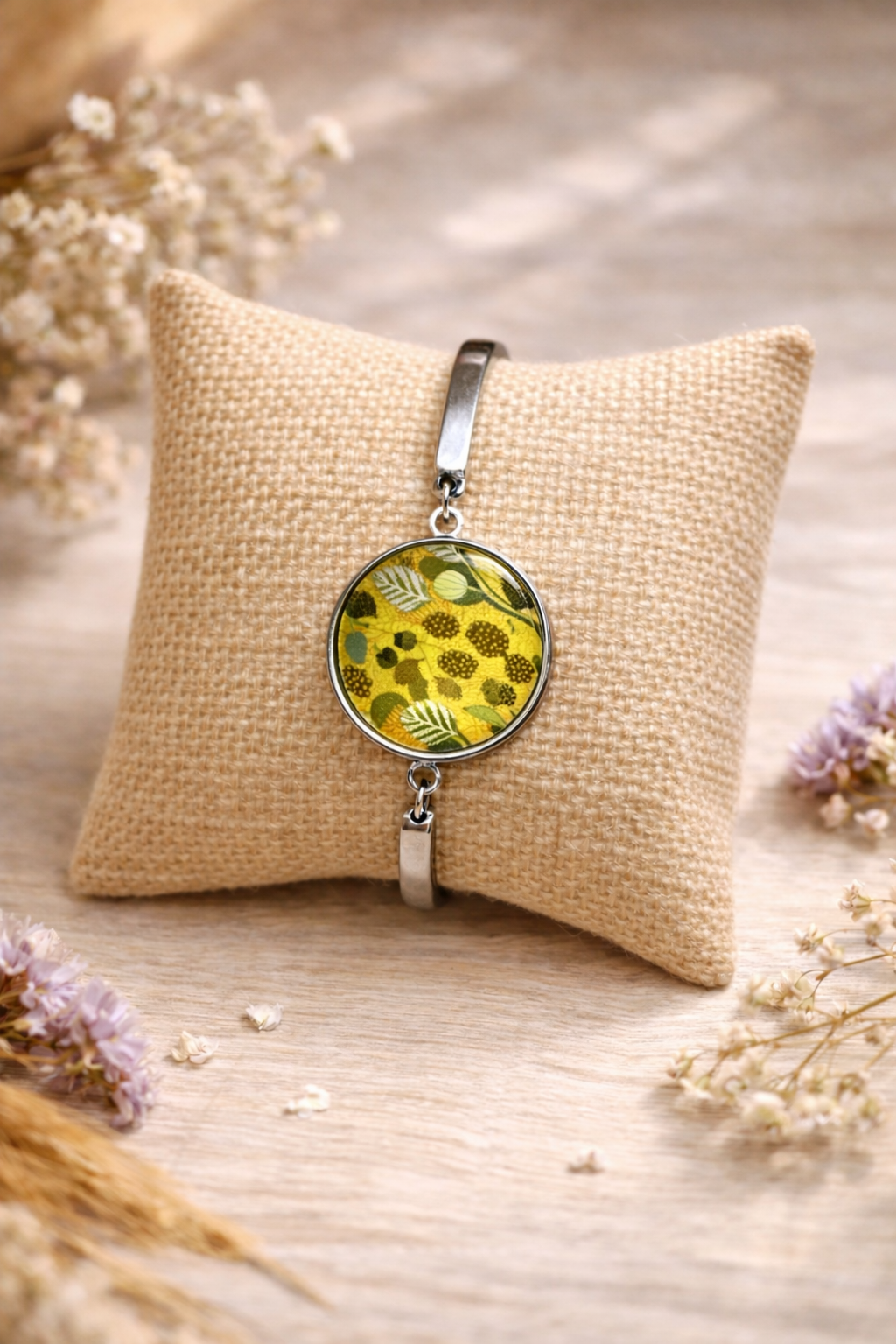 Bracelet au style bohème chic, composé d’un cabochon rond délicatement illustré, monté sur une base en acier inoxydable.