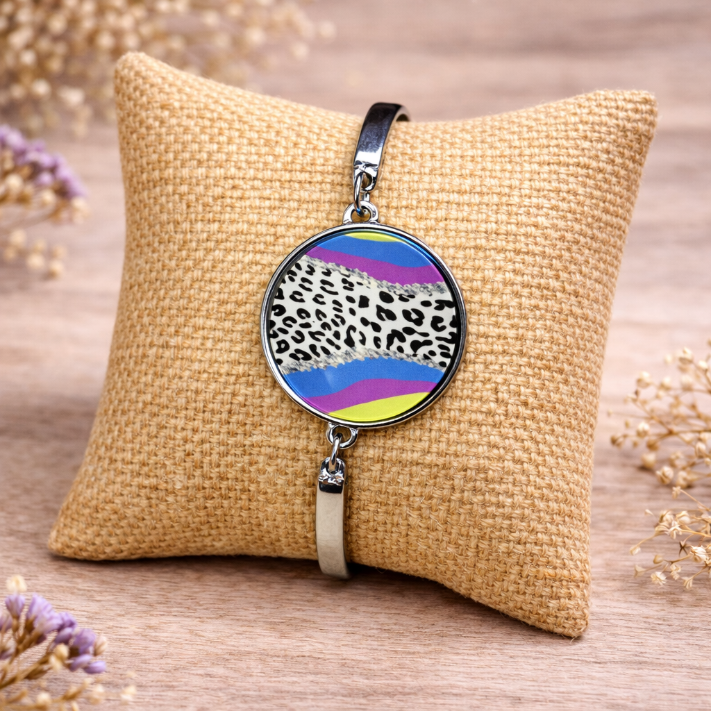 Bracelet au style bohème chic, composé d’un cabochon rond délicatement illustré, monté sur une base en acier inoxydable.