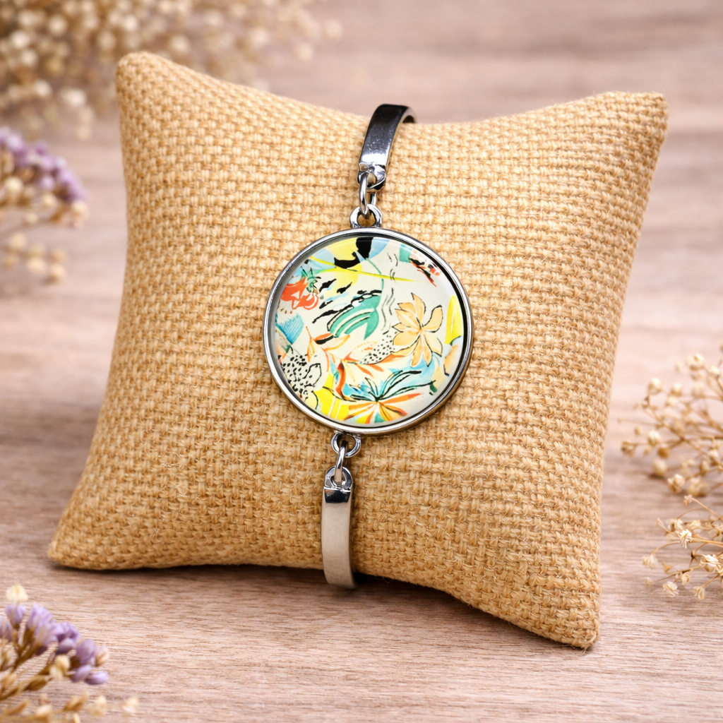 Bracelet au style bohème chic, composé d’un cabochon rond délicatement illustré, monté sur une base en acier inoxydable.