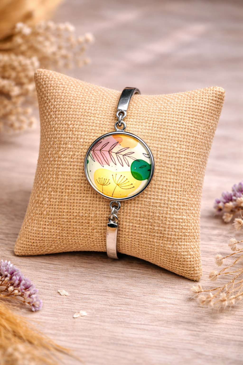 Bracelet au style bohème chic, composé d’un cabochon rond délicatement illustré, monté sur une base en acier inoxydable.