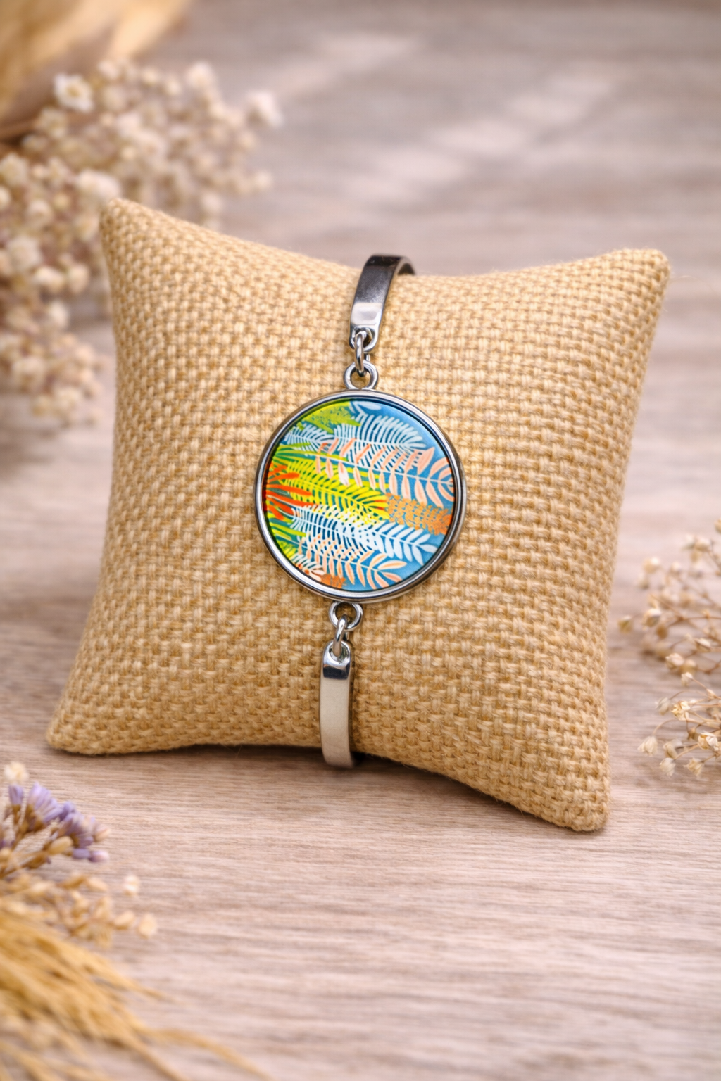 Bracelet au style bohème chic, composé d’un cabochon rond délicatement illustré, monté sur une base en acier inoxydable.