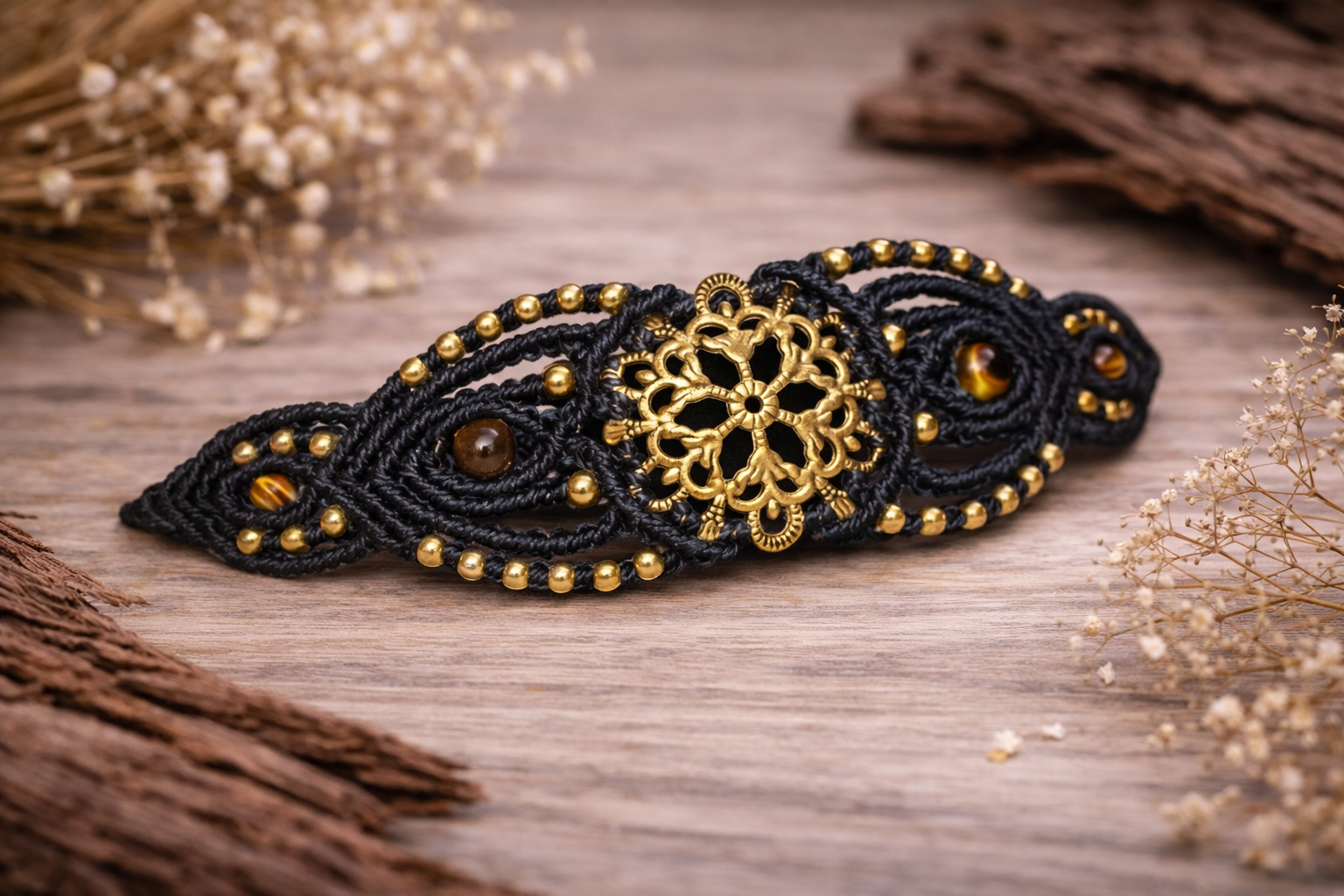 La rosace centrale symbolise l’harmonie et l’équilibre, renforçant l’esprit protecteur et apaisant de ce bracelet.