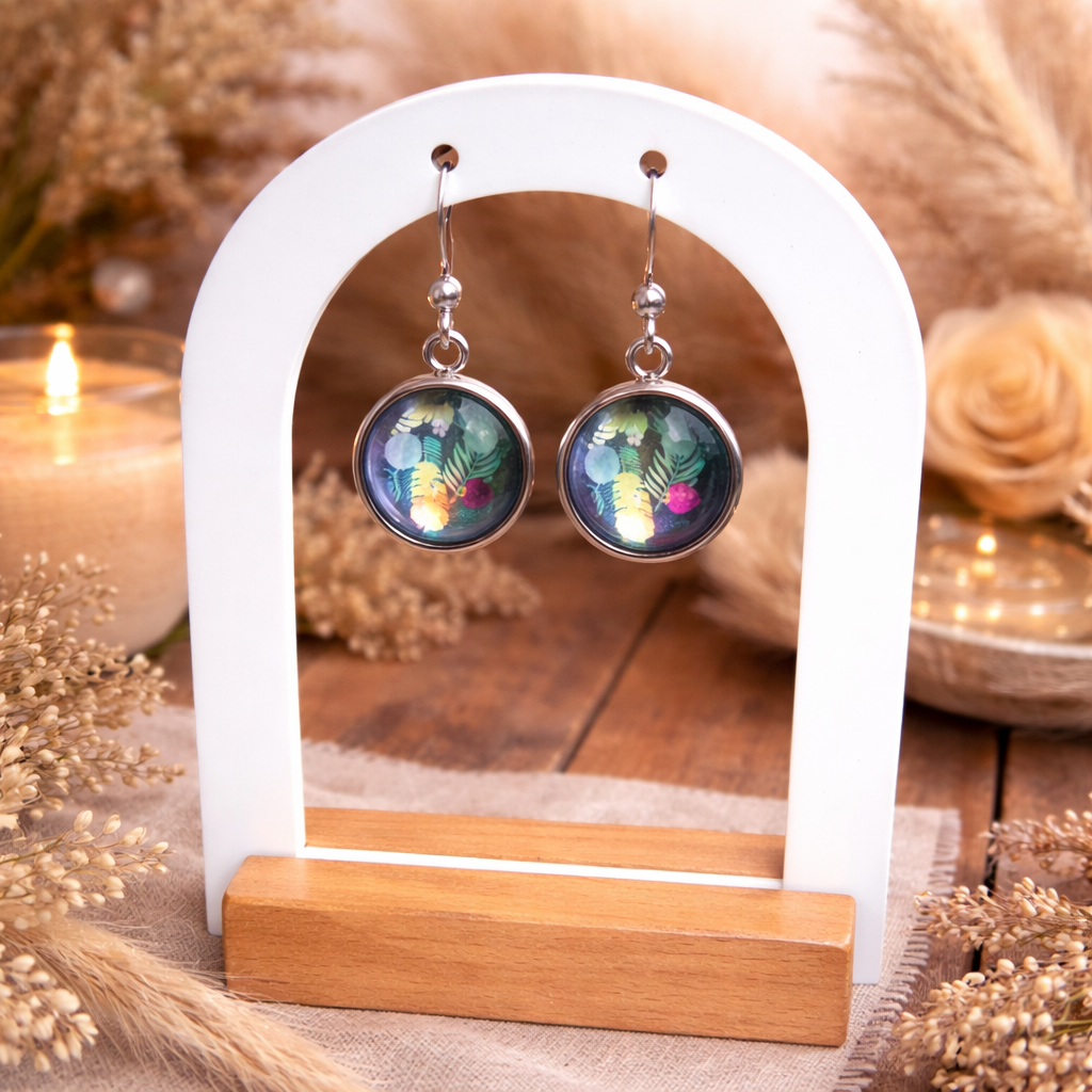 ✨ Boucles d’oreilles cabochon illustré – Motif végétal bohème