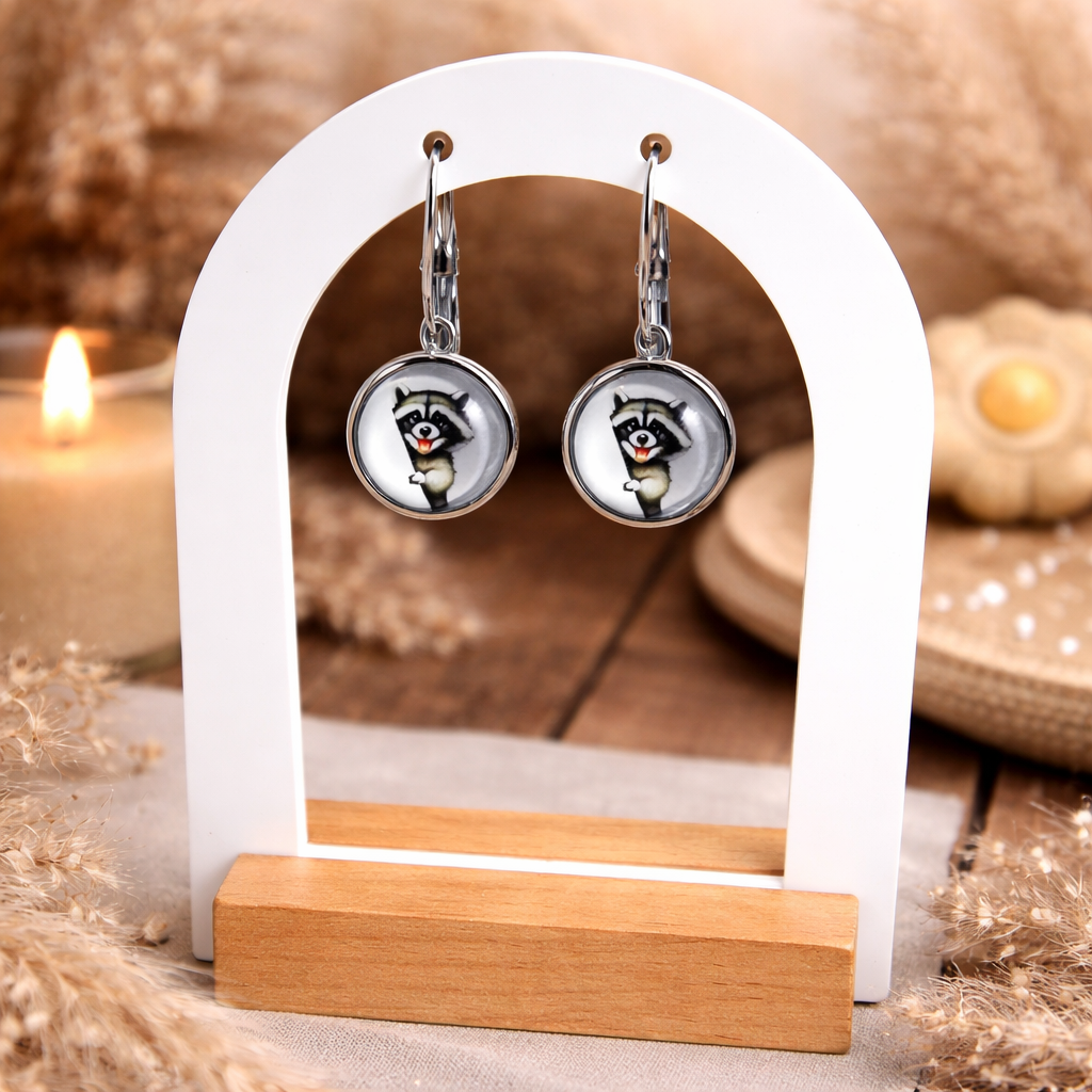 Boucles d’oreilles cabochon raton laveur – acier inoxydable et verre