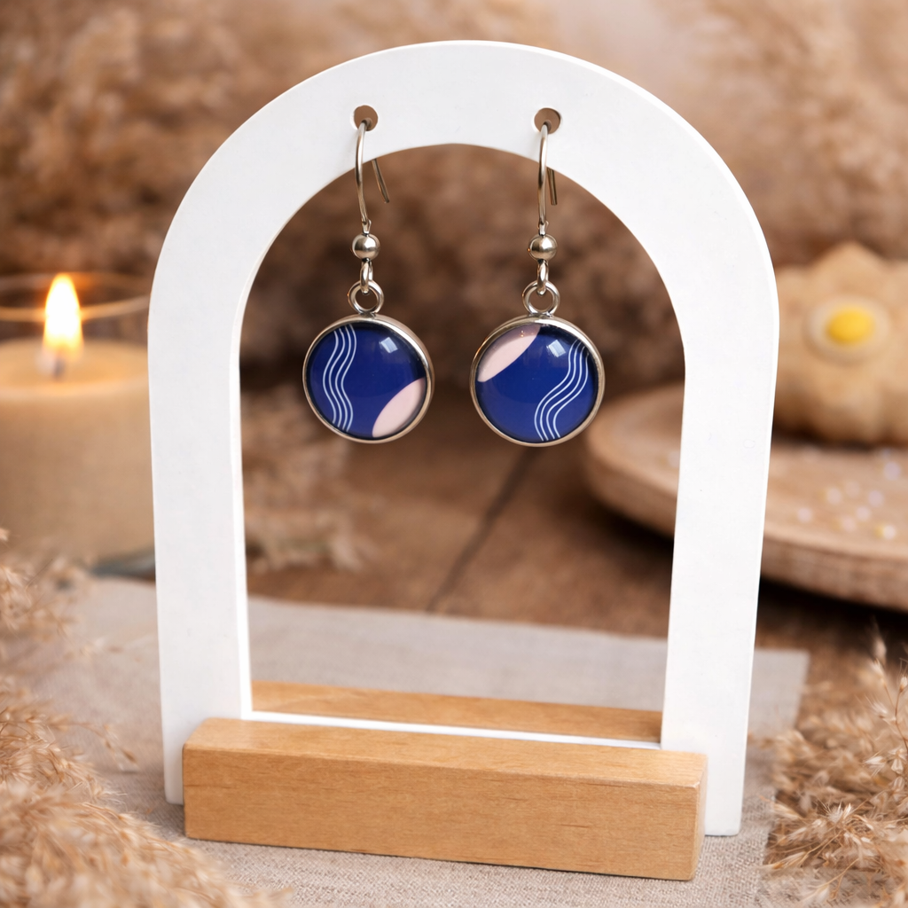 Boucles d’oreilles cabochon motifs abstraits bleu et lignes ondulées – acier inoxydable et verre