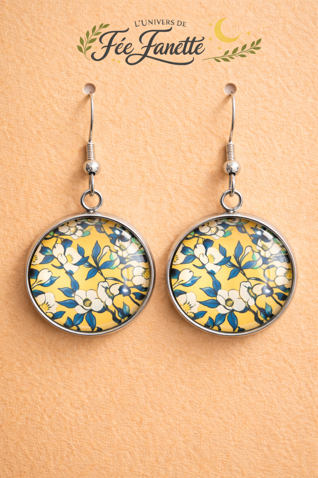Ces boucles d’oreilles dévoilent un motif floral raffiné mêlant des fleurs blanches et bleues sur un fond jaune éclatant.