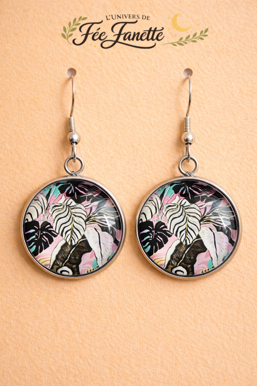 Ces boucles d’oreilles arborent un motif végétal stylisé aux couleurs pastel et aux formes élégantes.