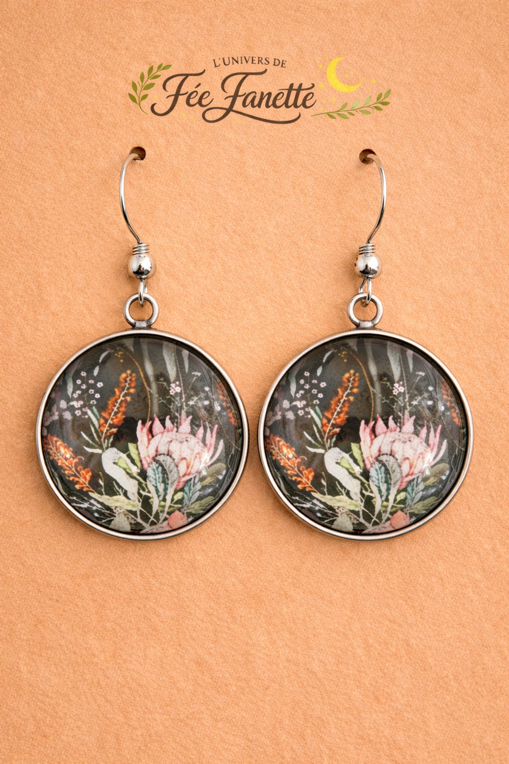 Le motif floral détaillé rappelle les planches botaniques anciennes. Les teintes naturelles et la composition élégante donnent à ce bijou un style raffiné et intemporel.
