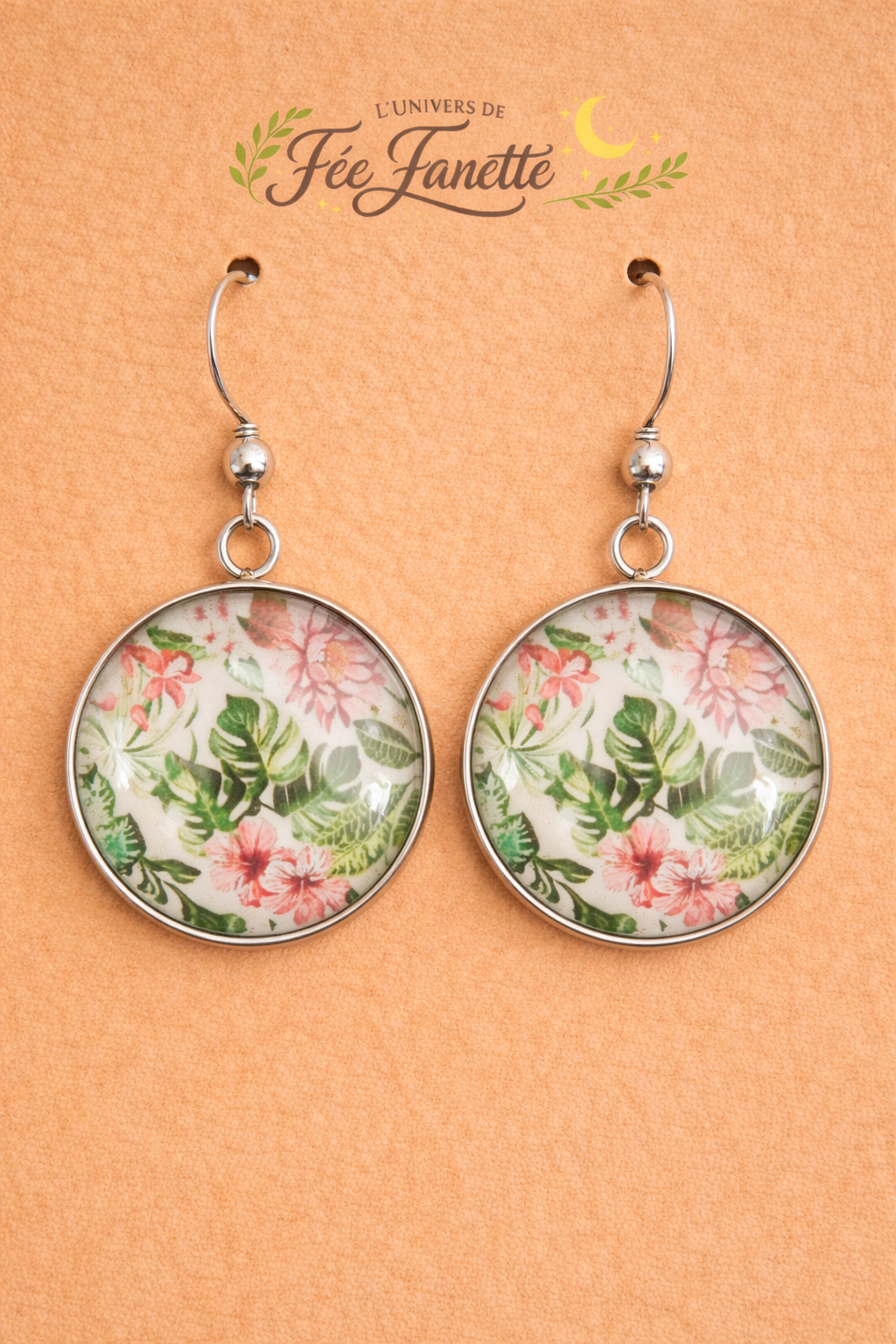 Boucles d’oreilles cabochon – Fleurs tropicales pastel