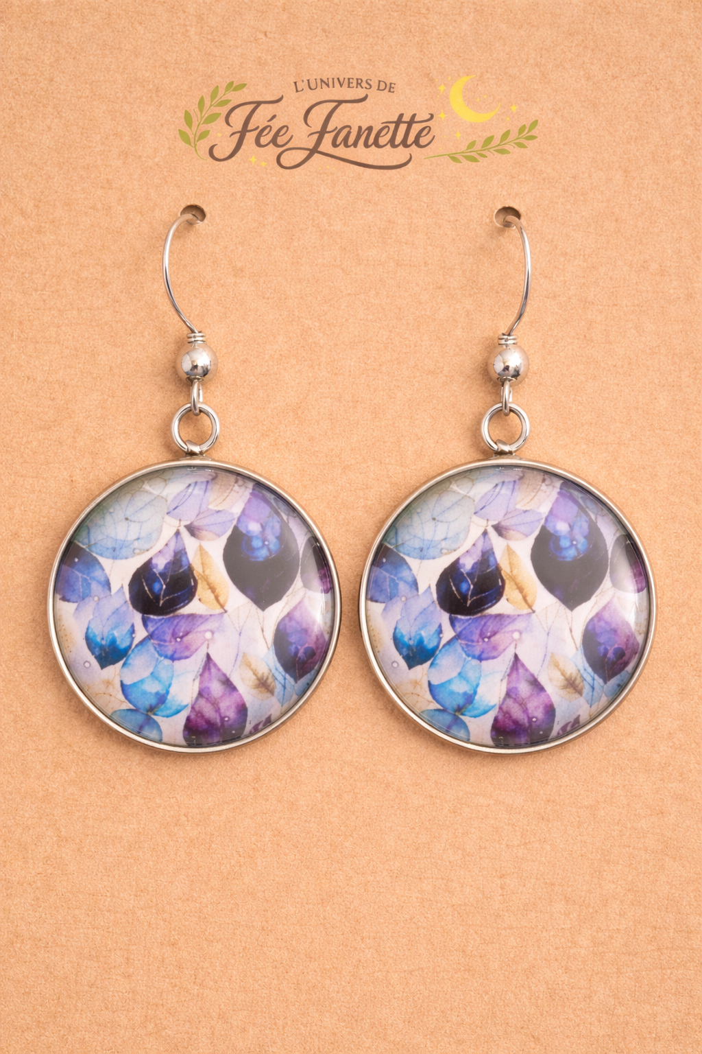 Boucles d’oreilles cabochon – Feuilles aquarelle violettes