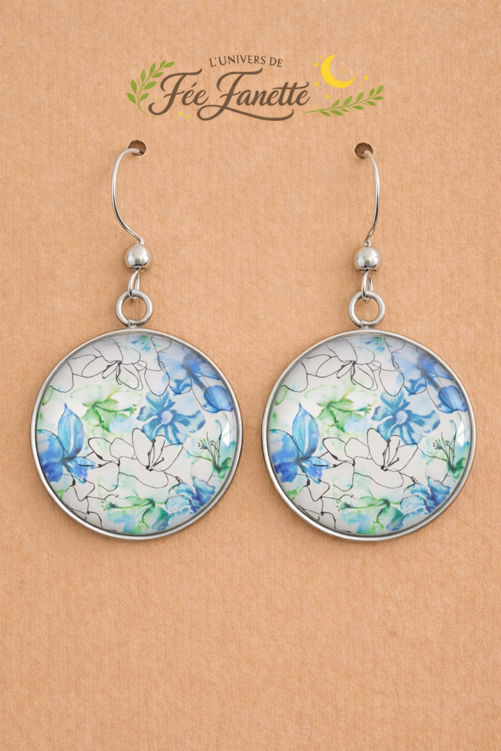 Boucles d’oreilles cabochon – Fleurs bleues minimalistes